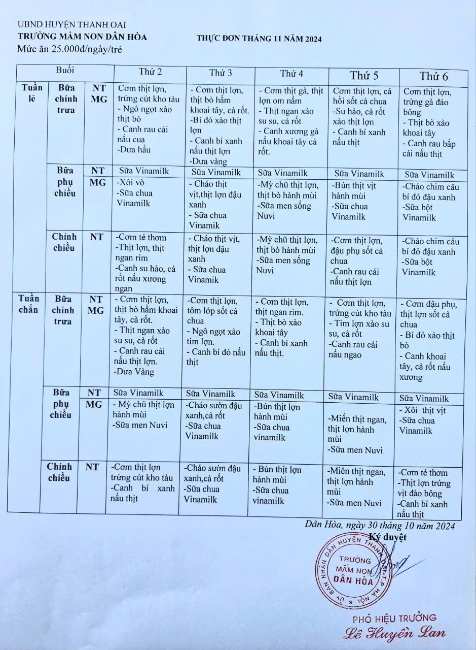 Thực đơn của trẻ trường Mầm non Dân Hoà